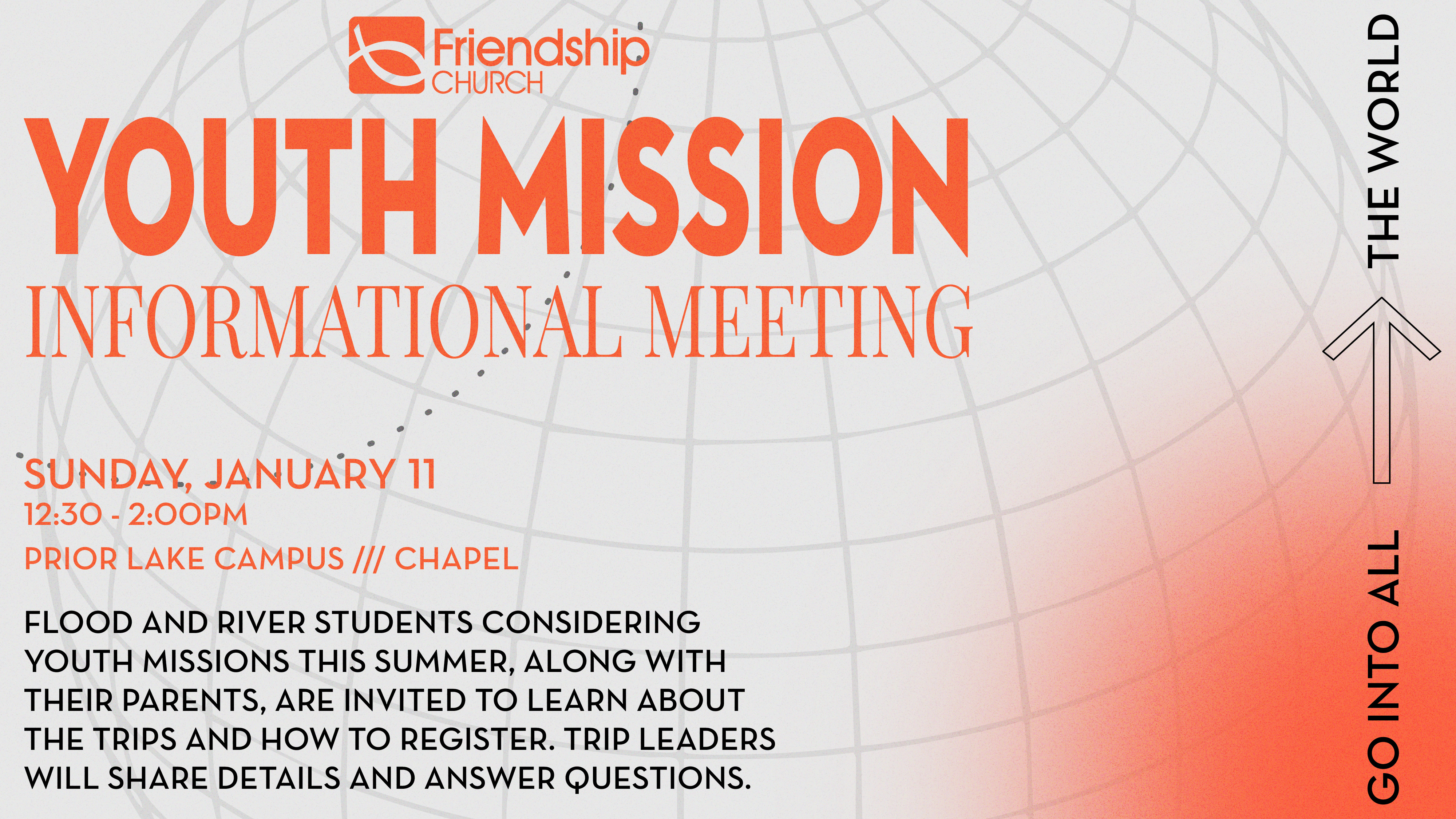 Flood and River students considering youth missions this summer and their parents are invited to learn about the trips being offered and how to register. Leaders for each trip will present information and take questions.