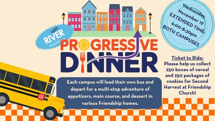 River students will come together for a special, extended evening of travel and culinary surprises. Please check in promptly at 6:00pm. Each campus will load their own bus and depart for a multi-stop adventure of appetizers, main course, and dessert in various Friendship homes. Bus returns by 8:30pm. Invite your friends and come make a memory with your River crew!